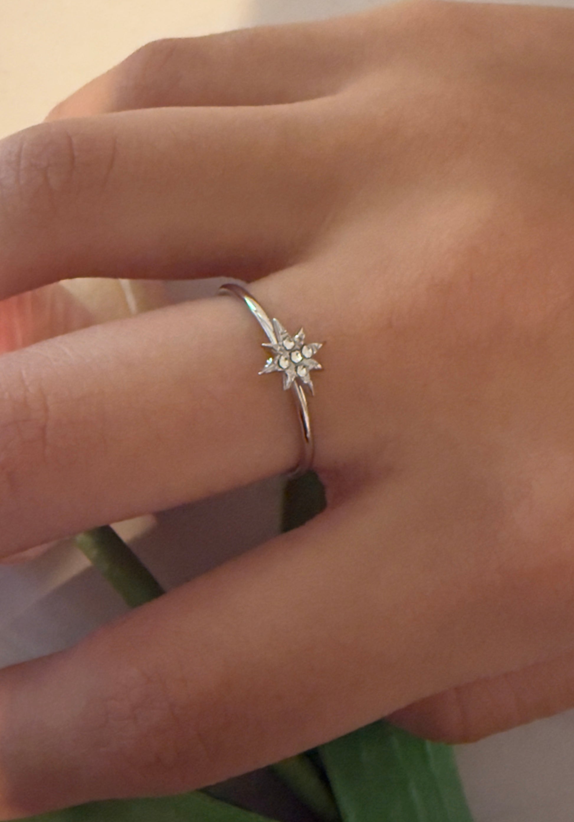 Este anillo ajustable y fino destaca por su delicado detalle en forma de estrella con brillo, ideal para usar solo o combinar en un look minimalista.