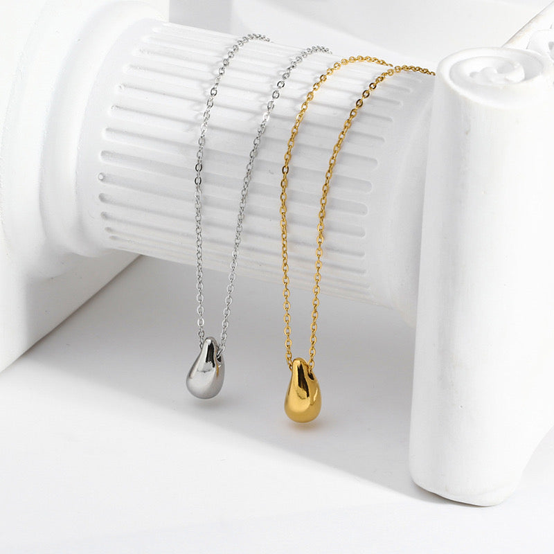 Collar minimalista con dije en forma de gota, con acabado brillante y delicado. Elegante, moderno y perfecto para usar solo o acompañado.