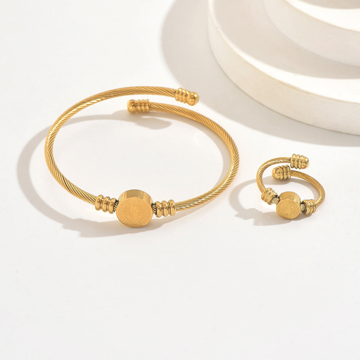 Conjunto de dos piezas en acabado dorado con diseño texturizado y detalle de esfera plana.