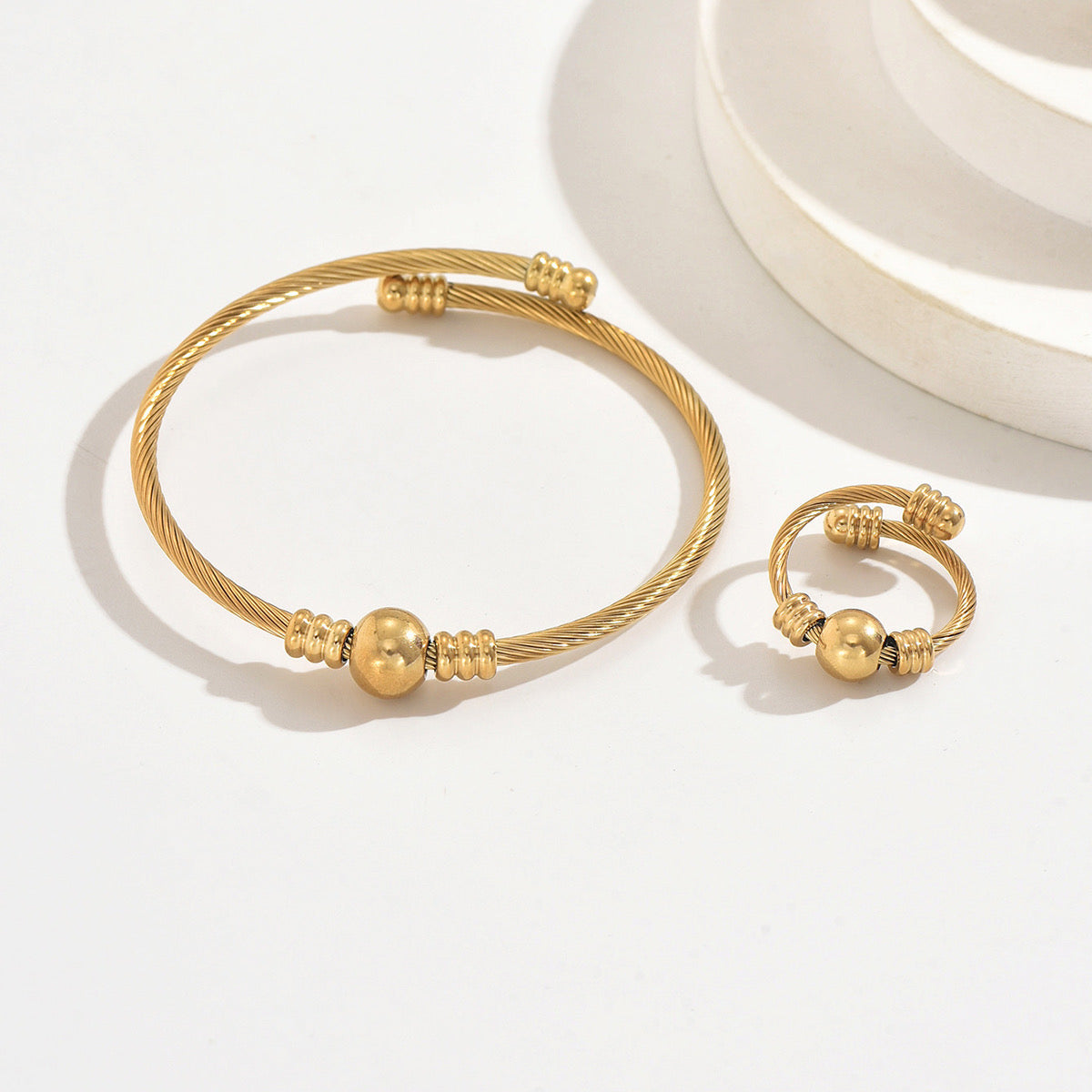 Conjunto de dos piezas en acabado dorado con diseño texturizado y detalle esférico. Elegancia y brillo en un solo set.