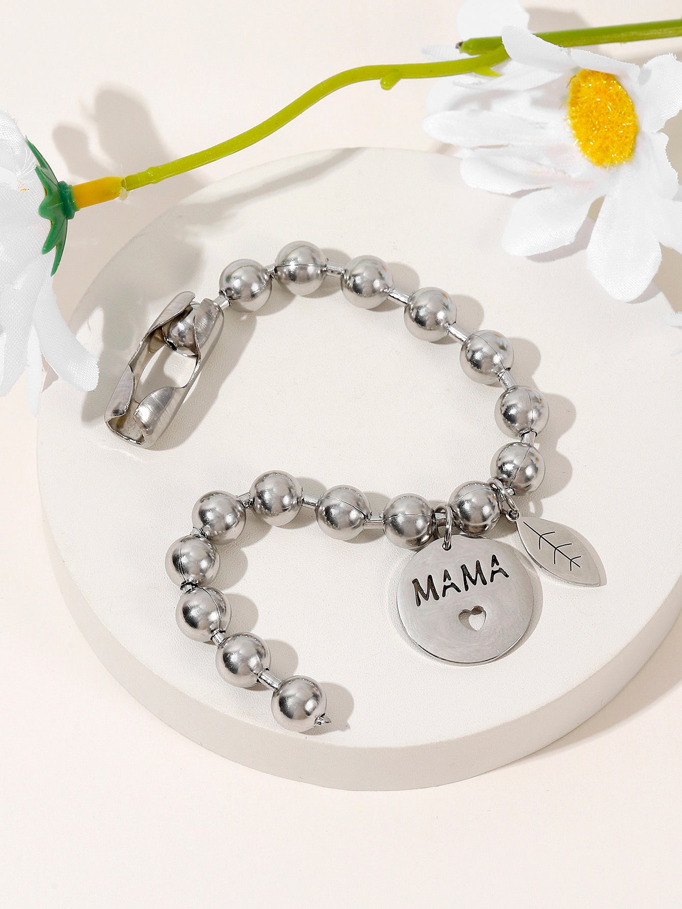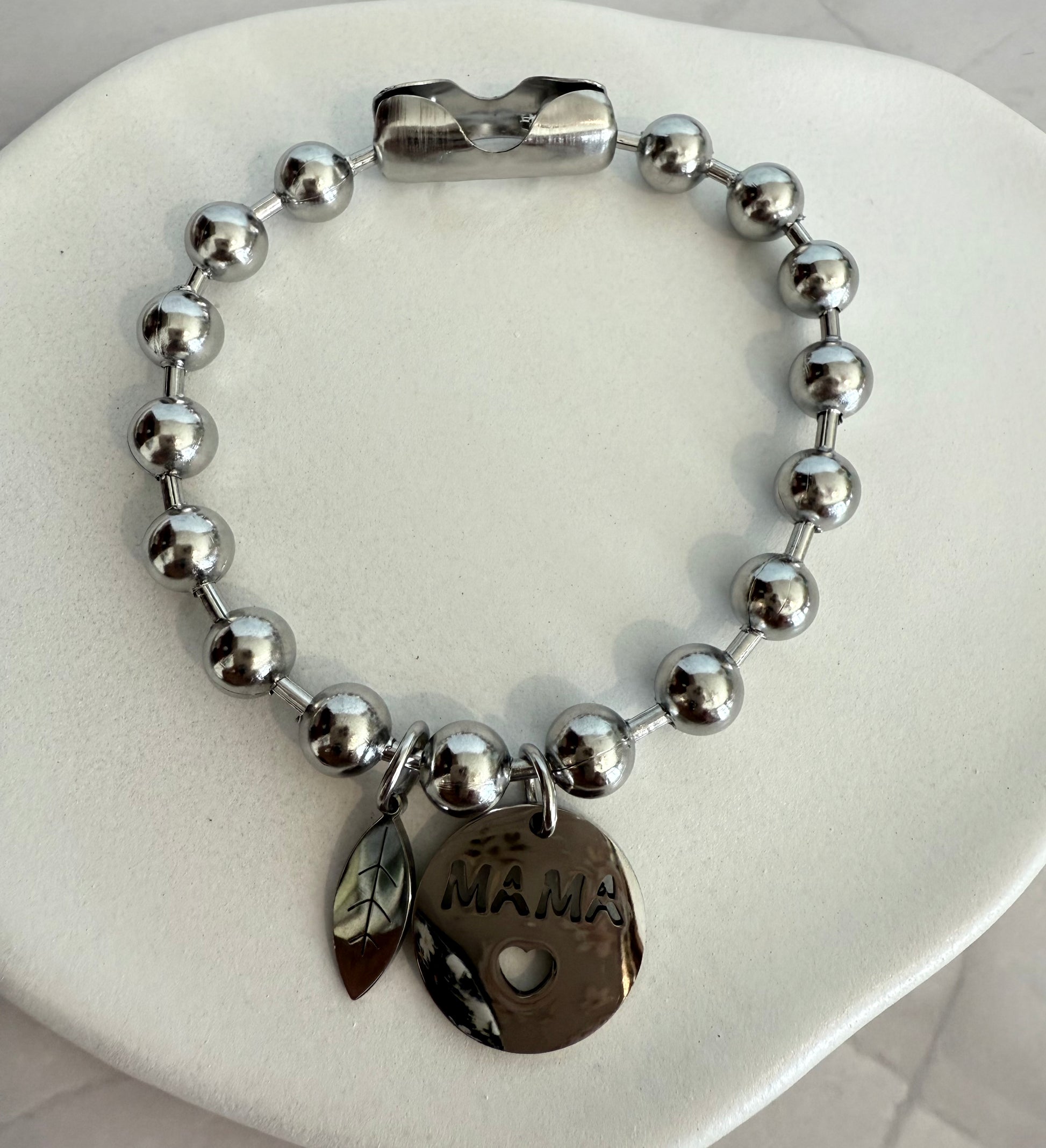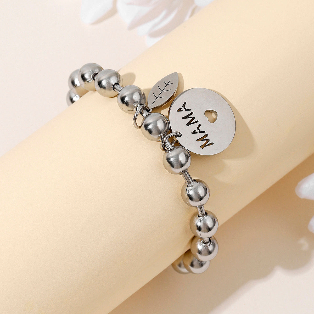 Pulsera con charm de Mamá y charm de hoja. Resistente, especial para regalo y perfecta para uso diario.