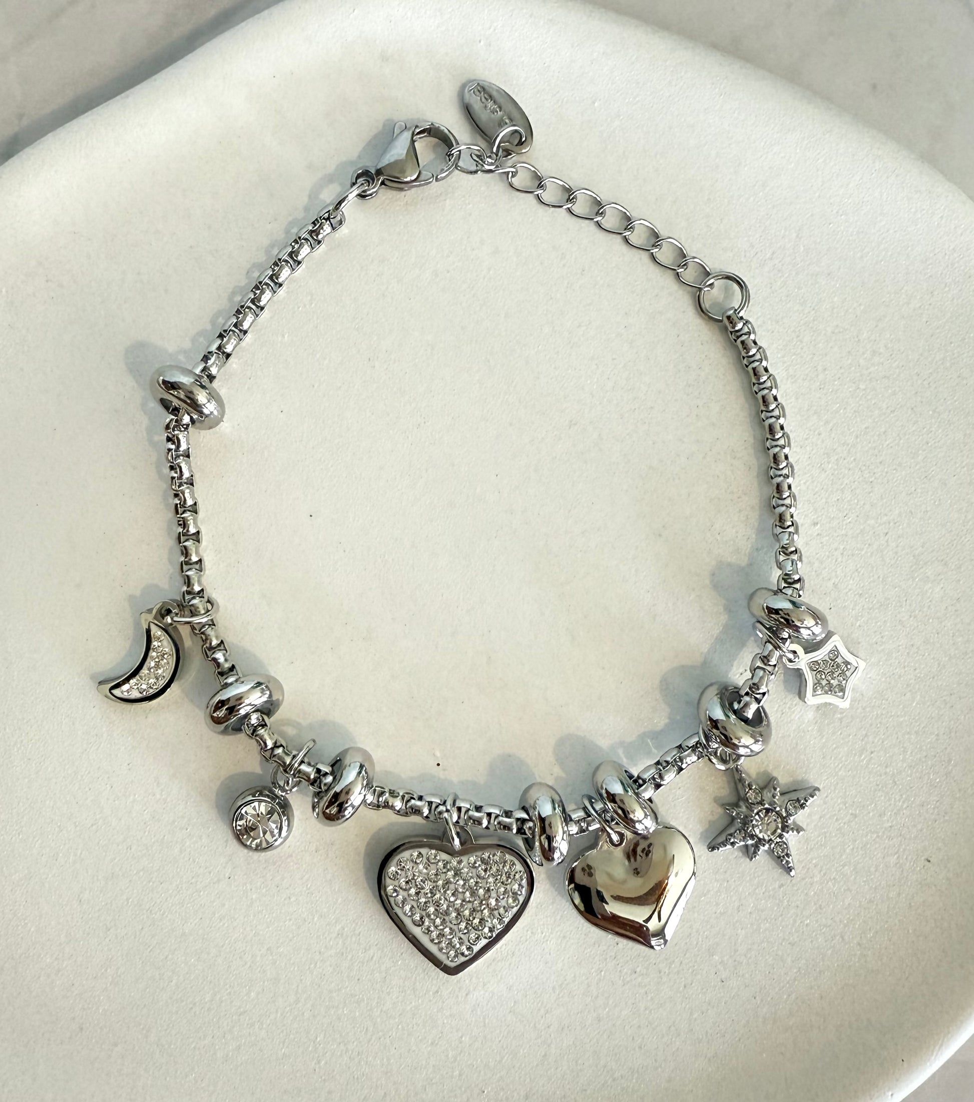Pulsera en stainless steel con charms de corazón y estrellas. Ideal para uso diario o regalo especial.